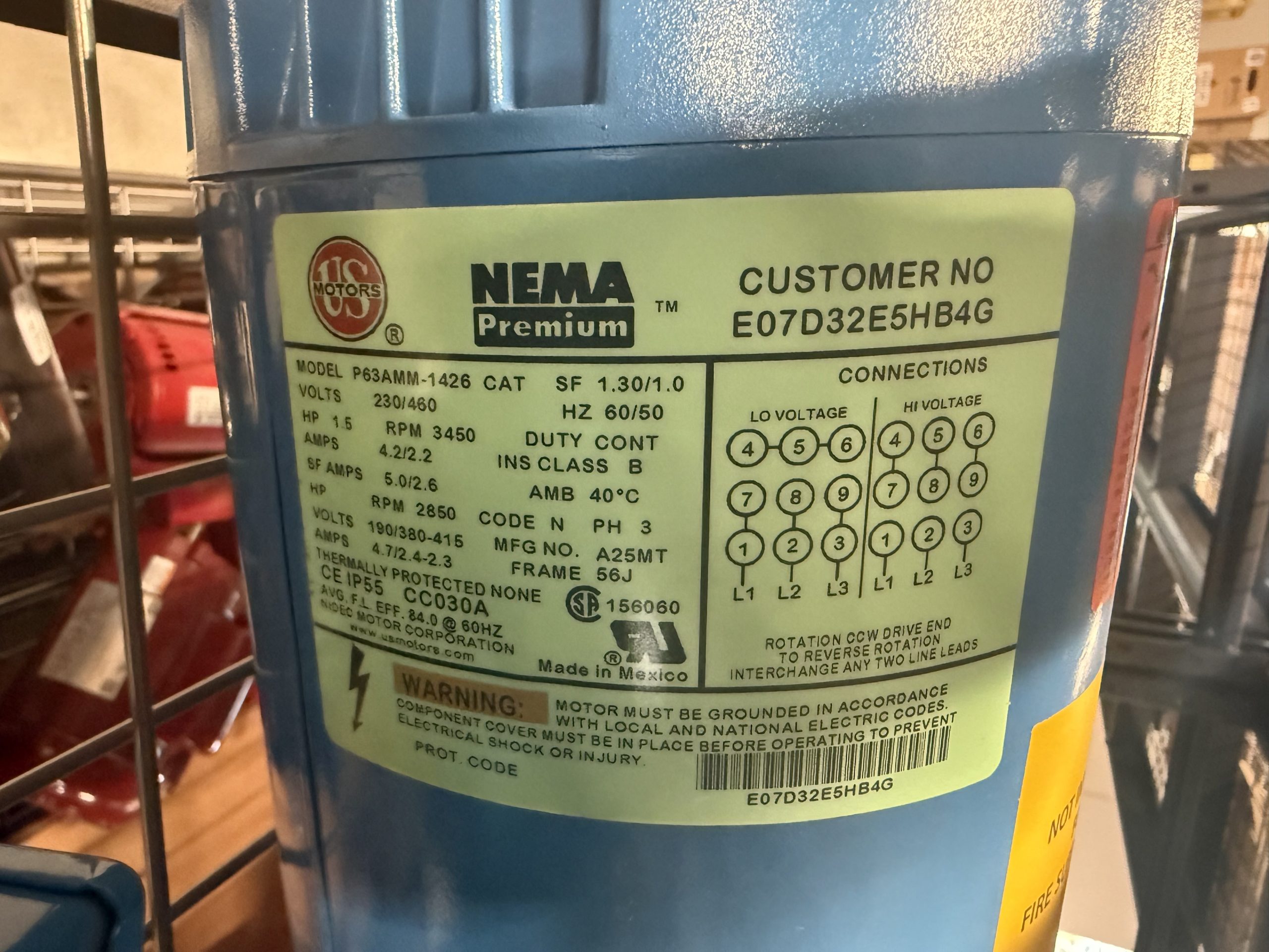 1.5 HP Pump Motor, Premium Efficient, Three Phase, 1.5 3/60/50/208-230-460 2P TEPE 56J