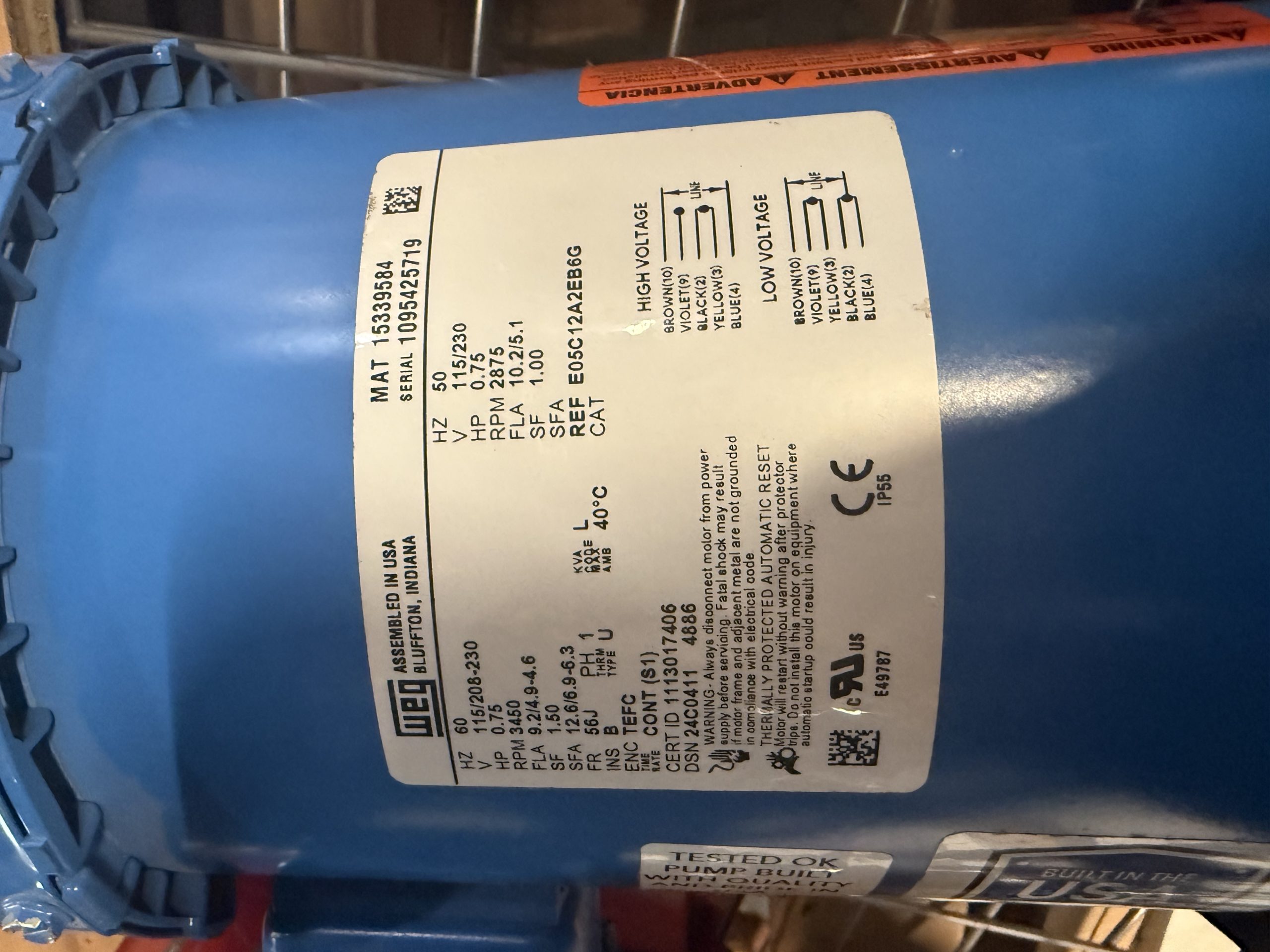 Weg E05C12A2EB6G 3/4 HP Pump Motor, Single Phase, 3/4 1/50/60/115-208-230 56J